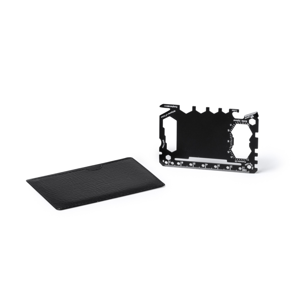 Narzędzie wielofunkcyjne ze stali nierdzewnej, wyposażone w 17 wbudowanych funkcji. Kompaktowe narzędzie obejmuje: otwieracz do puszek, ostry nóż, śrubokręt, linijkę, otwieracz do butelek, klucz nastawny, klucz motylkowy, piłę, kierunkowskaz i kątomierz. Produkt zapakowany w etui wykonane z PU.