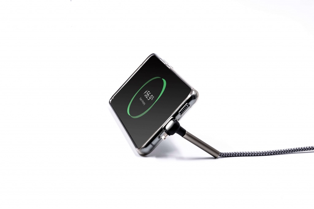 - Zintegrowany stojak na telefon: Po podłączeniu i ładowaniu telefon może być ustawiony na kablu, pełniąc funkcję stojaka.