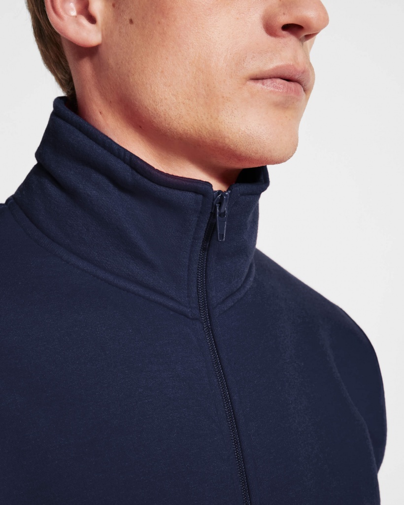 Bluza z wysokim kołnierzem zapinana na niezawodny, kolorystycznie dopasowany zamek błyskawiczny. Wnętrze kołnierza w tym samym odcieniu z dodatkowo wzmocnioną obwódką. Mankiety i pas wykonane z prążkowanej dzianiny 1x1.