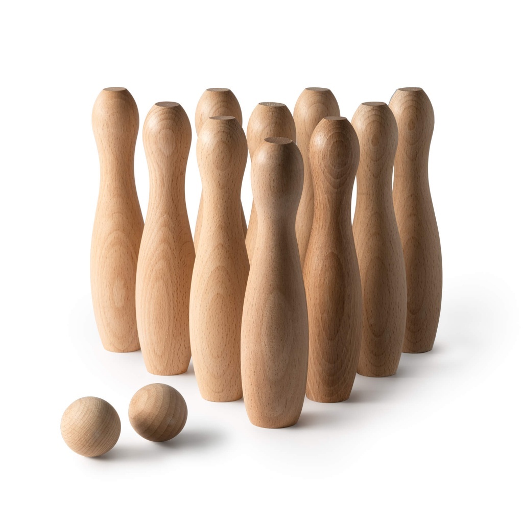 Drewniana zabawka — kręgle zawierająca 10 kręgli oraz 2 kule.