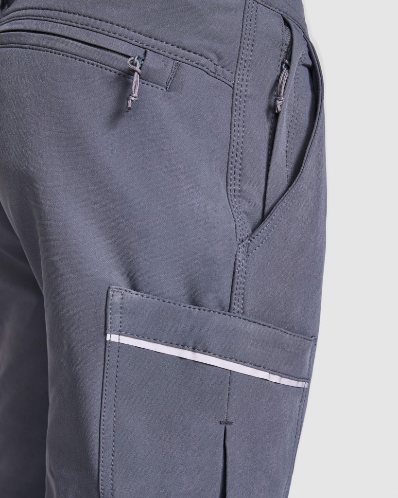 · Kieszeń na kolanach z klapą, taśmą odblaskową i zapięciem na rzep.