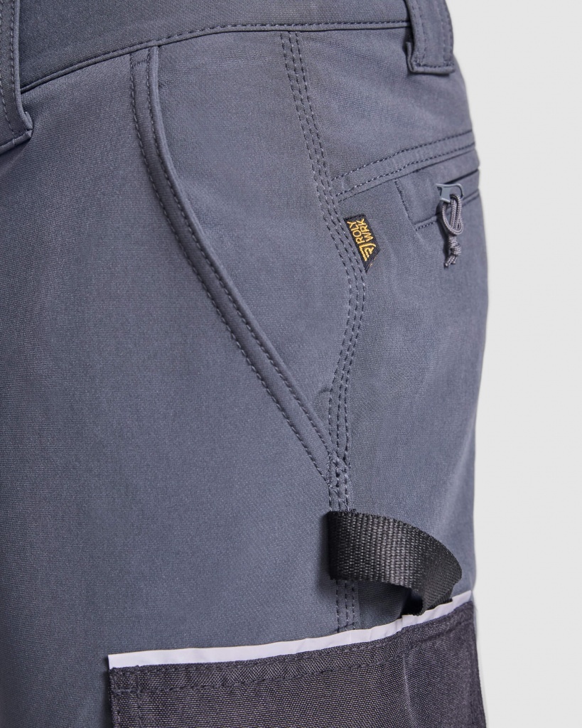 Elastyczne spodnie robocze z wieloma kieszeniami.