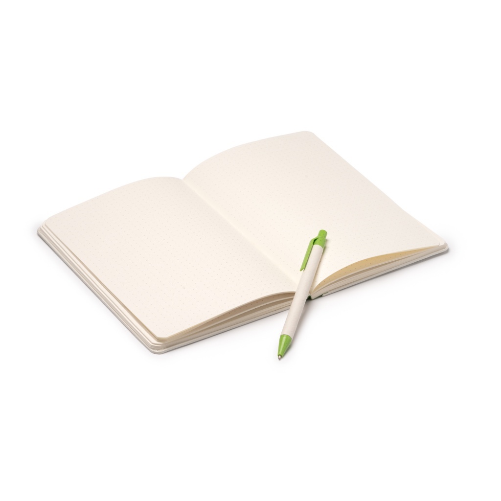 Notatnik formatu A5 wykonany z recyklingowanych kartonów po mleku. Twarda okładka wyposażona w elastyczną gumkę oraz zakładkę w kolorze dopasowanym do dołączonego długopisu z przyciskiem. Zawiera 80 gładkich kartek, zapewniając dużo miejsca na zapiski i szkice. Doskonały do codziennego użytkowania, łączy praktyczność, estetykę i dbałość o środowisko.