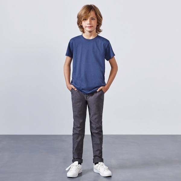 T-shirt z krótkim rękawem. Podwójna tkanina z dodatkiem elastanu przy kołnierzu. Brak szwów bocznych w wersji dla dorosłych, szwy boczne w wersji dziecięcej. Wzmocnione, kryte szwy przy karczku.
