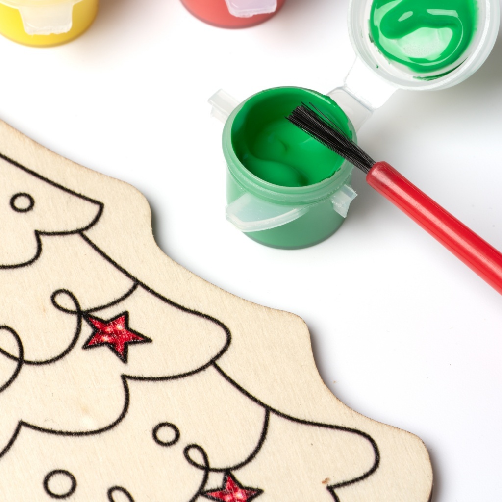 A wooden Christmas coloring set that includes a brush and three paints, ideal for children to express their creativity during the holidays.