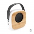 Compact Bluetooth speaker featuring a rectangular body in cement with a natural bamboo top and a visible cone. Comes with an imitation leather handle and includes cable. 3W output with a rechargable battery. Presented in an eco design box.