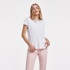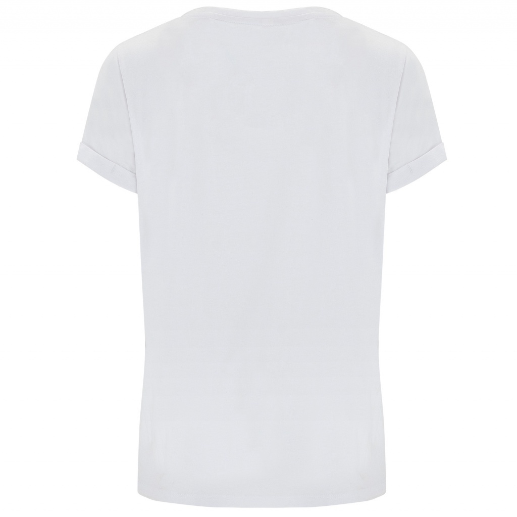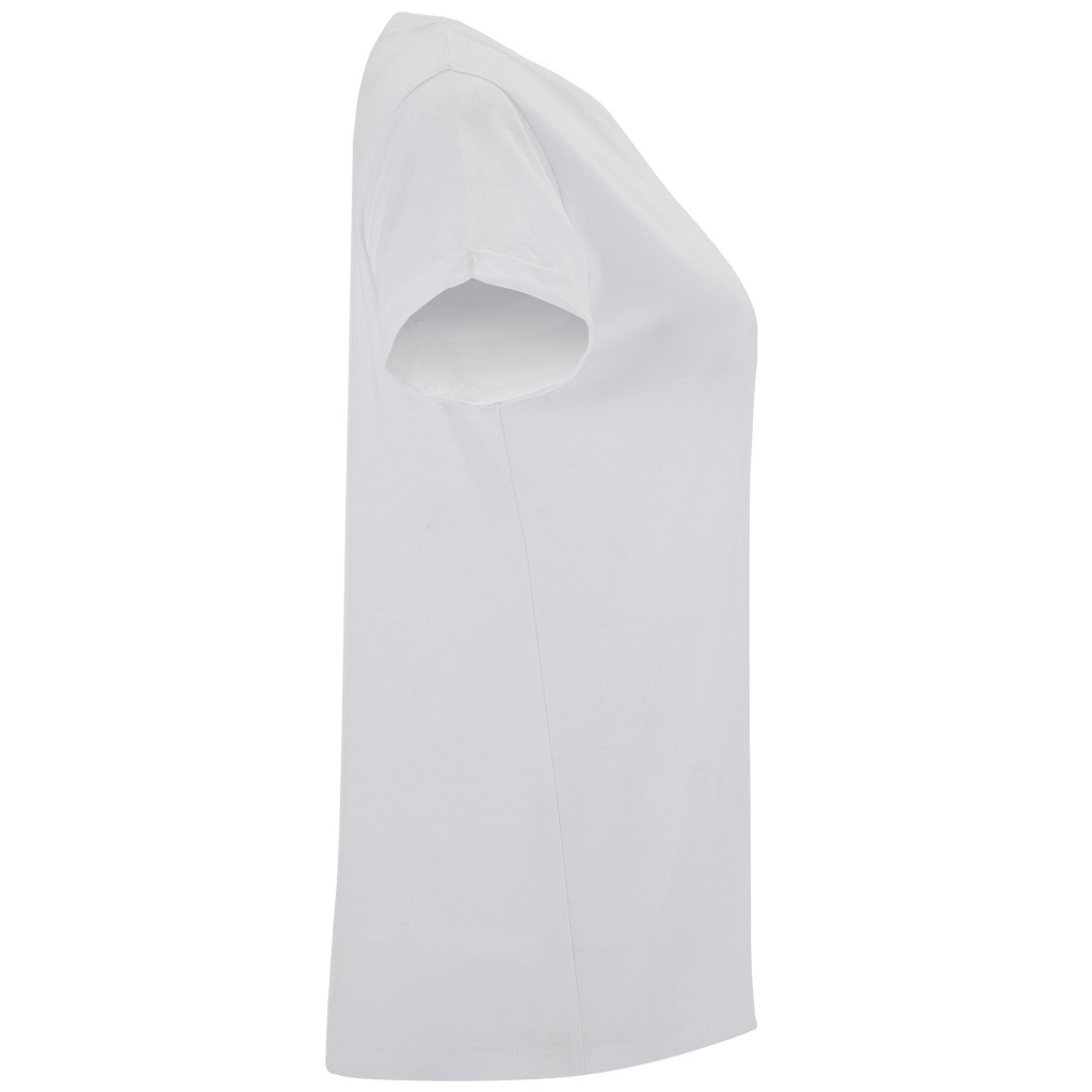Women's short-sleeve T-shirt featuring a round neckline made from the same fabric. Neck seams are reinforced and covered in matching color. Sleeves are roll-up style with reinforcement at four points.