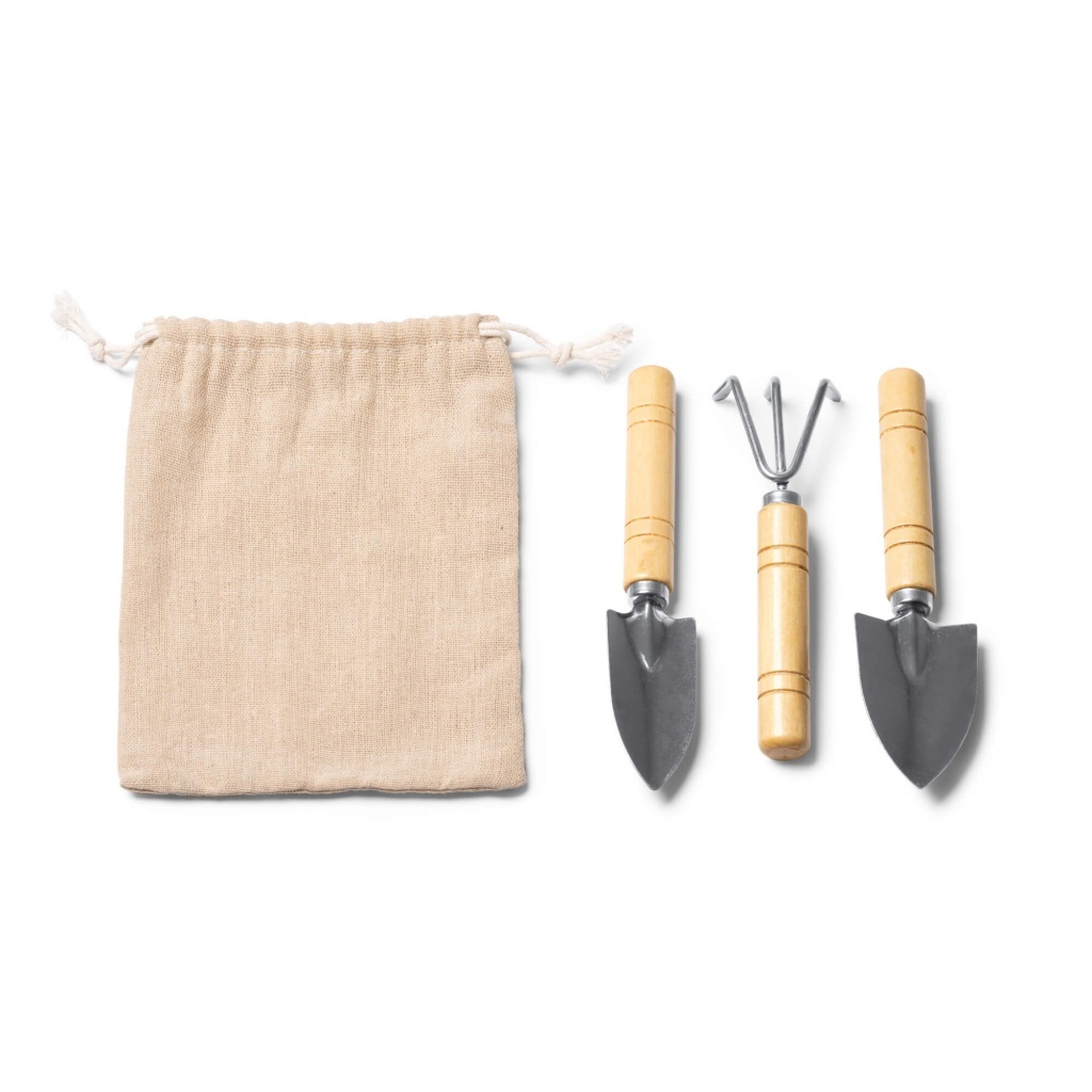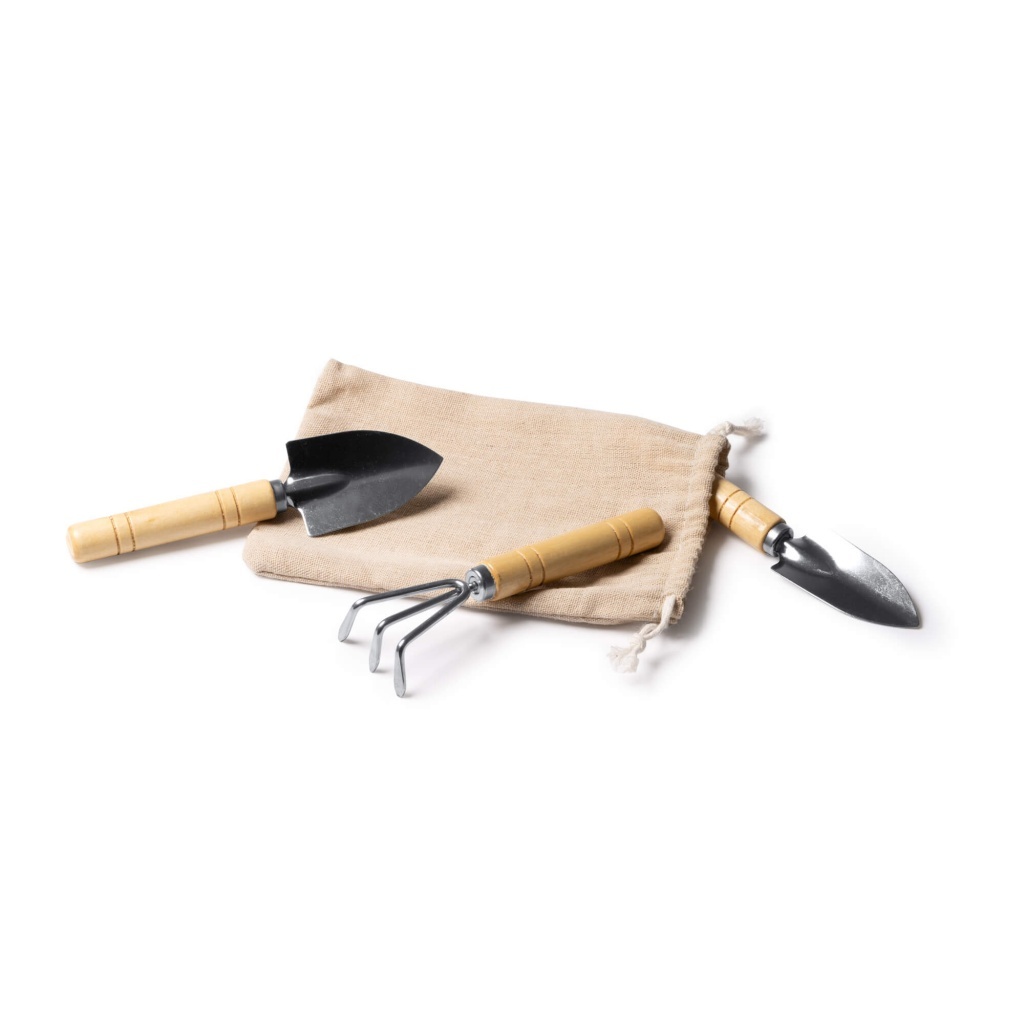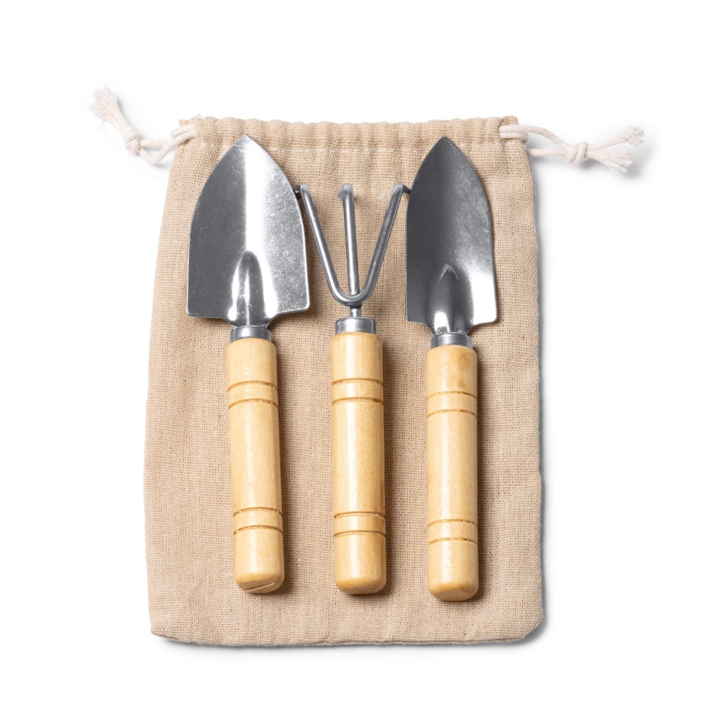 Three-piece gardening tool set crafted from stainless steel with bamboo handles, including two transplanting trowels and one rake. The set comes with a cotton pouch and is packaged in an environmentally friendly box.