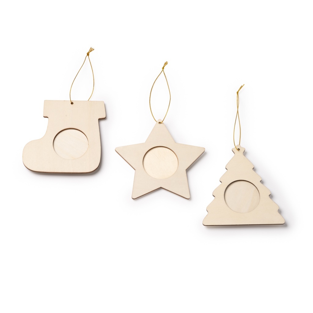 Wooden Christmas photo frame decoration. Photo size: 4,5 cm diameter.