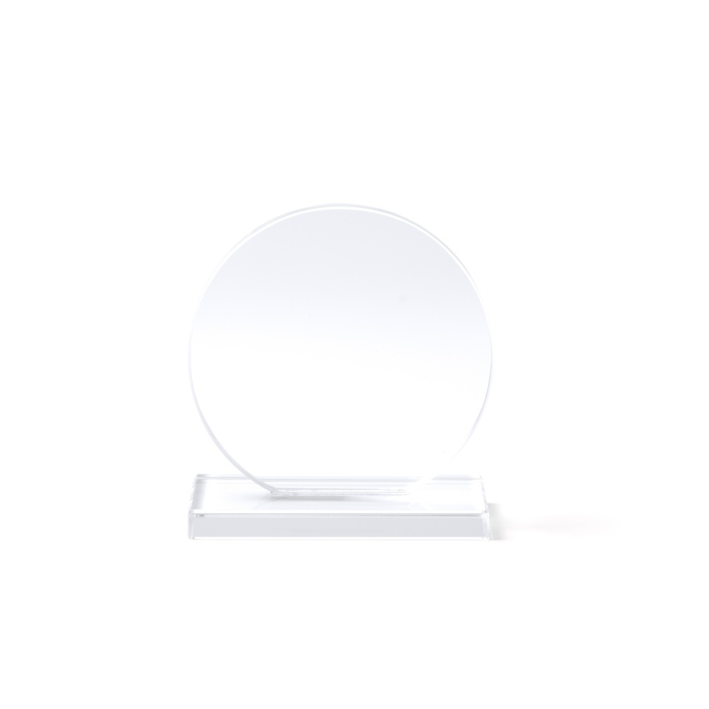 Round-shaped glass trophy with a rectangular base. Black case included.