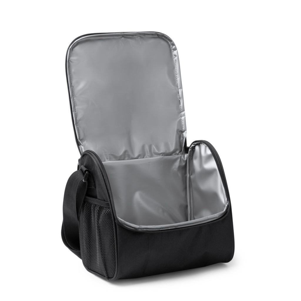 Insulated thermal bag crafted from durable 600D RPET fabric. Features a main compartment with isothermal interior, a zippered front pocket and two side pockets, plus an adjustable carrying strap.