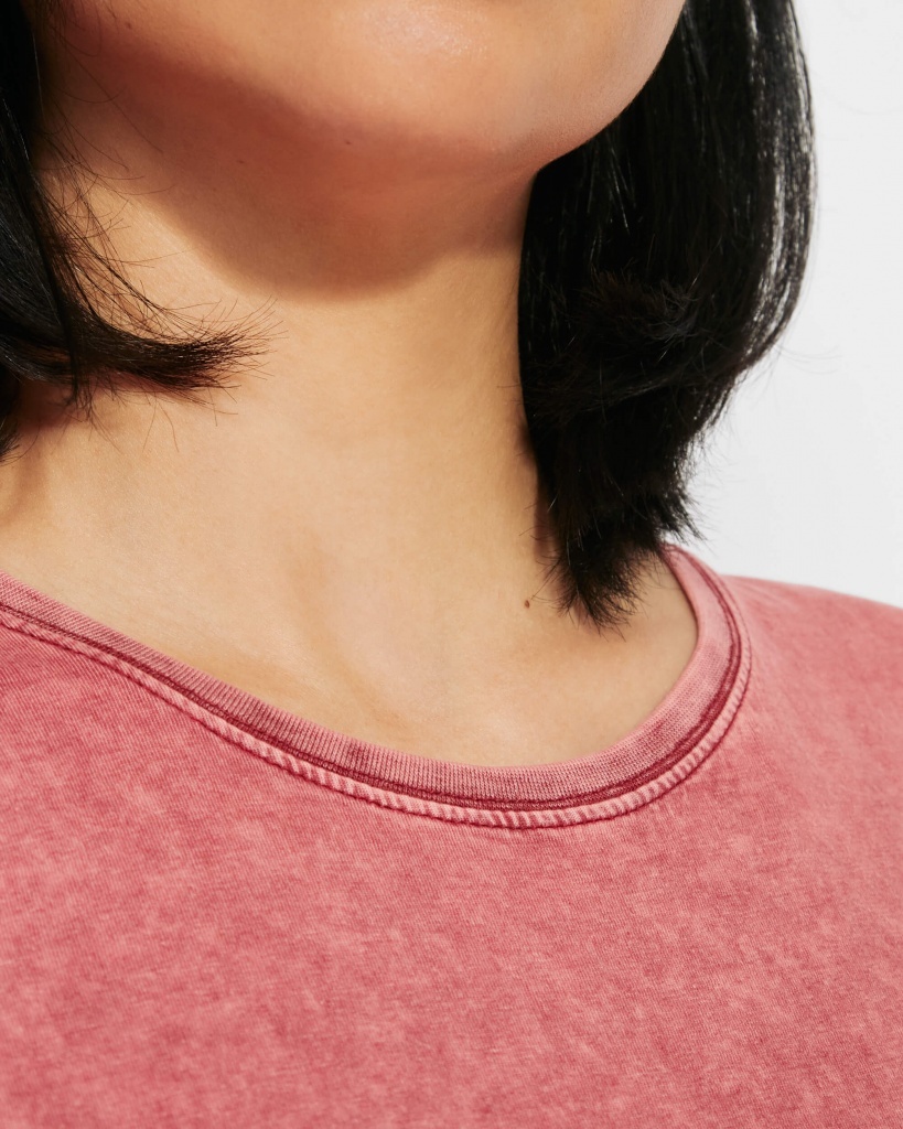 Short-sleeve women's t-shirt with a jeans-effect finish. Featuring a 1x1 rib crew neck and reinforced shoulder-to-shoulder seam coverings. Armholes have a double seam and sleeves are finished with a hem. The HUSKY WOMAN t-shirt's slim round neck adds a feminine touch.