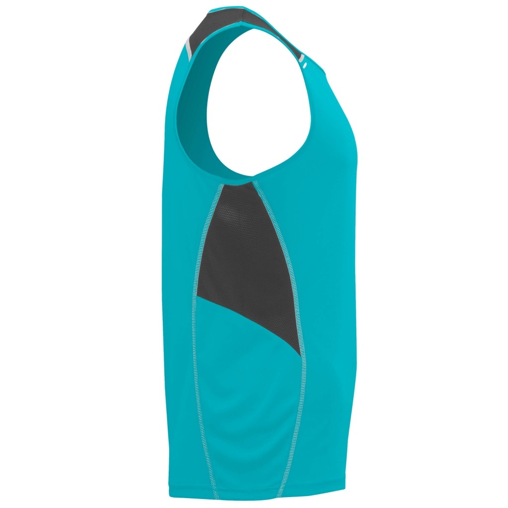 Lightweight technical tank top featuring reflective accents. Round neck with reinforced covered seams. Constructed from two polyester fabrics in three colours. Main body in interlock fabric, side and upper panels in microperforated fabric to enhance breathability. Fast-drying.
