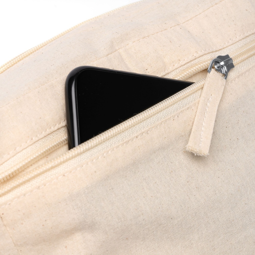 Practical cosmetic bag made of 100% cotton 150 gsm with zipper closure. Designed with a double pocket layout featuring a main pocket and a side pocket for organized storage.