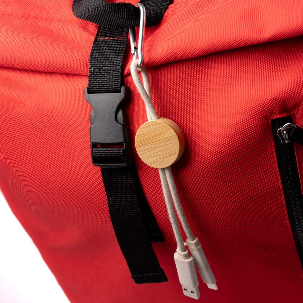 4-in-1 cable. Main construction made of bamboo, cotton cable and details made of wheat fiber. USB and USB Type C outputs. USB, USB type C and Lightning outputs. Carabiner included. Packaged in a separate bag designed with the environment in mind.