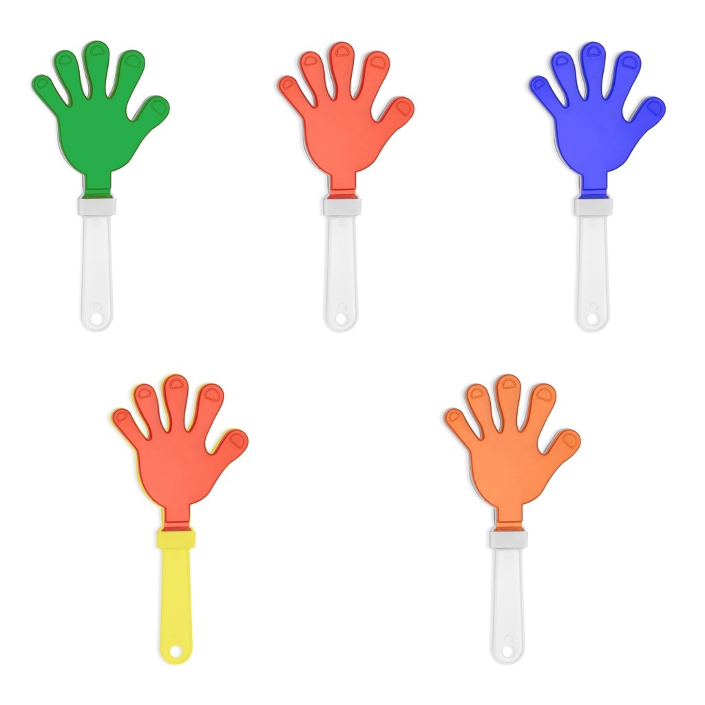 Two-colour hand-shaped clapper with handle.