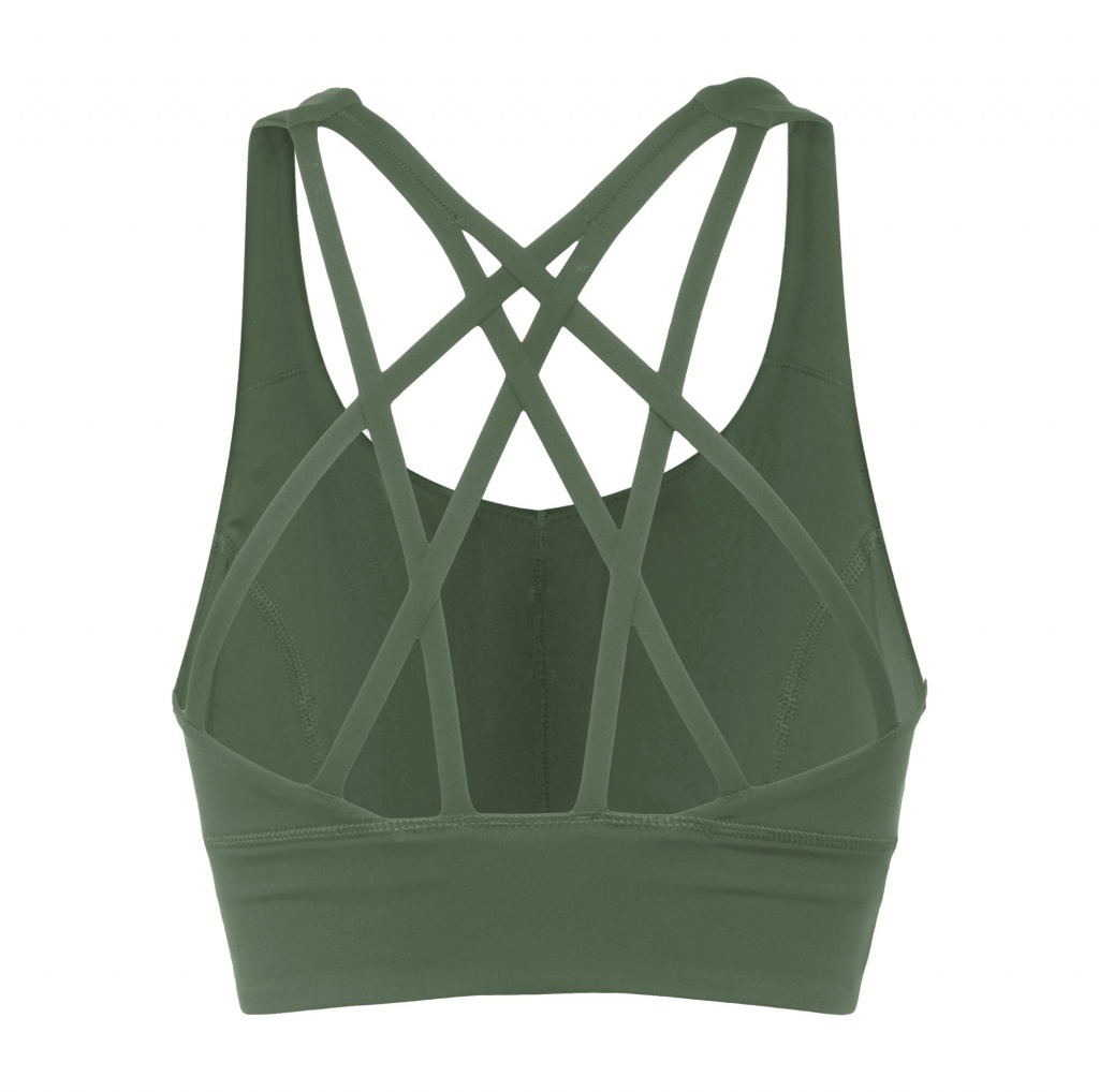 Technical women's top in breathable fabric. Features decorative crossed straps at back and a high-rise fit.