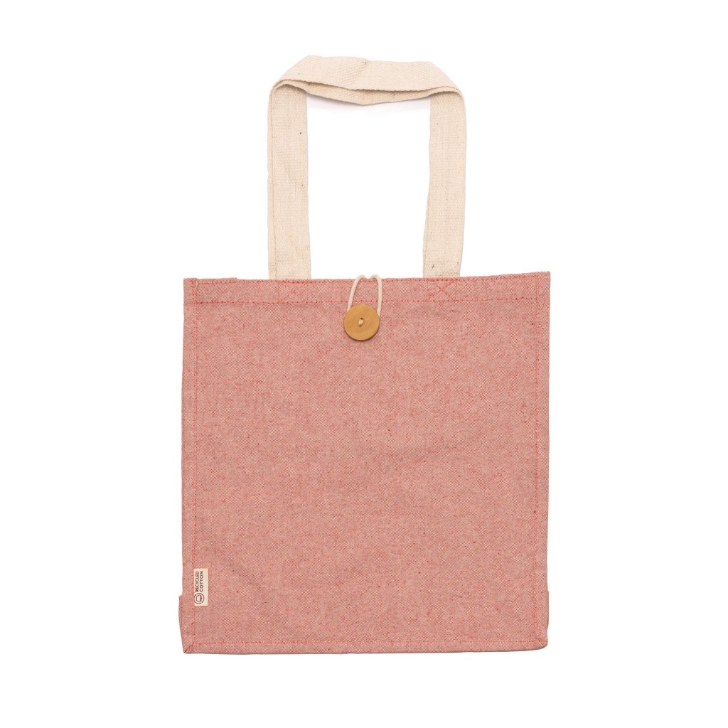 Recycled cotton bag with a heather finish. Handles are reinforced and measure 70 cm in length. Secures with a button closure.