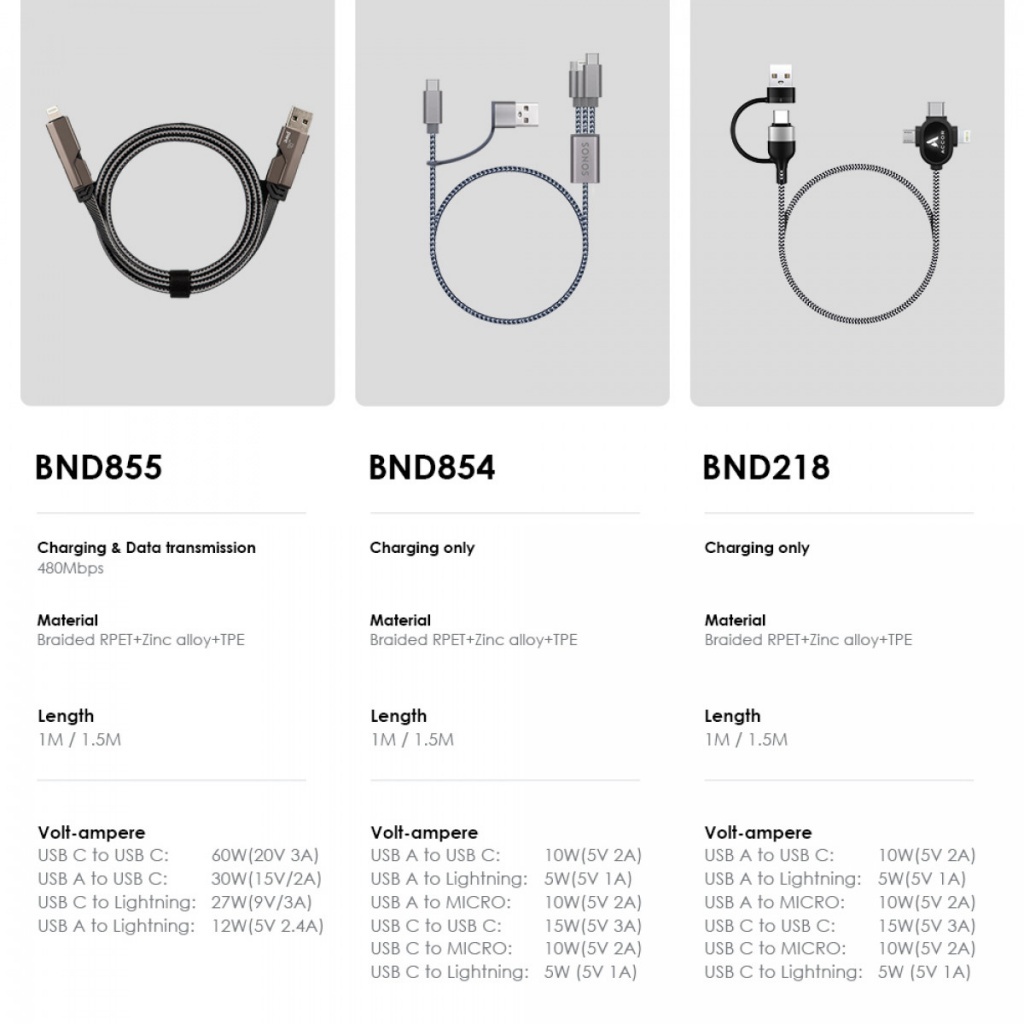 The BND855 Universal 4-in-1 Cable is a versatile, eco-conscious charging solution made from recycled PET. It includes four connector options—Lightning/USB-C and USB-A/USB-C—offering fast, reliable charging and data transfer. Capable of up to 60W charging power and a 480Mbps data rate, this cable supports a wide range of devices and usage scenarios. Available in 1m and 1.5m lengths, it pairs performance with sustainability. Detailed Output information: USB C to USB C: 60W (20V/3A)USB A to USB C: 30W (15V/2A)USB C to Lightening: 27W (9V/3A)USB A to Lightening: 12W (5V/2.4A).