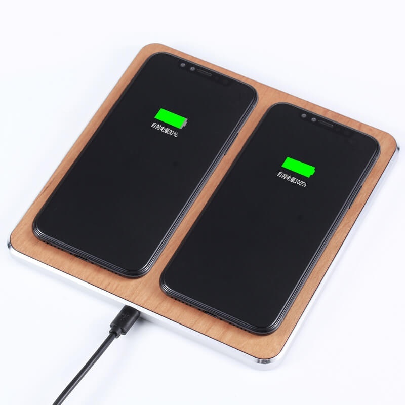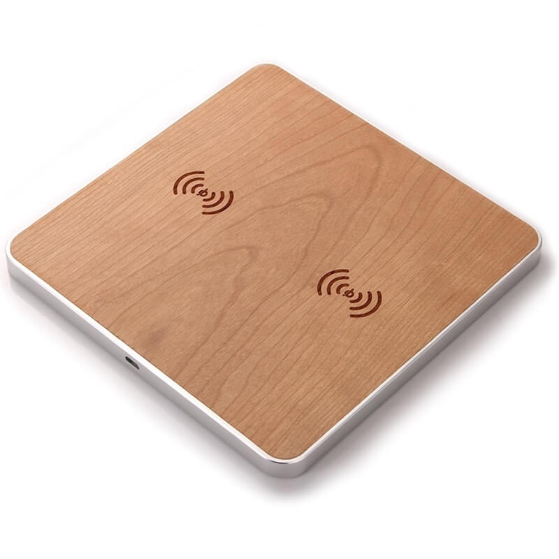 Elegant wooden wireless charger with dual 5W output. Designed for Qi-compatible devices, it charges two items at once when placed on the charging surface—an ideal blend of natural materials and convenient, cable-free power.