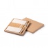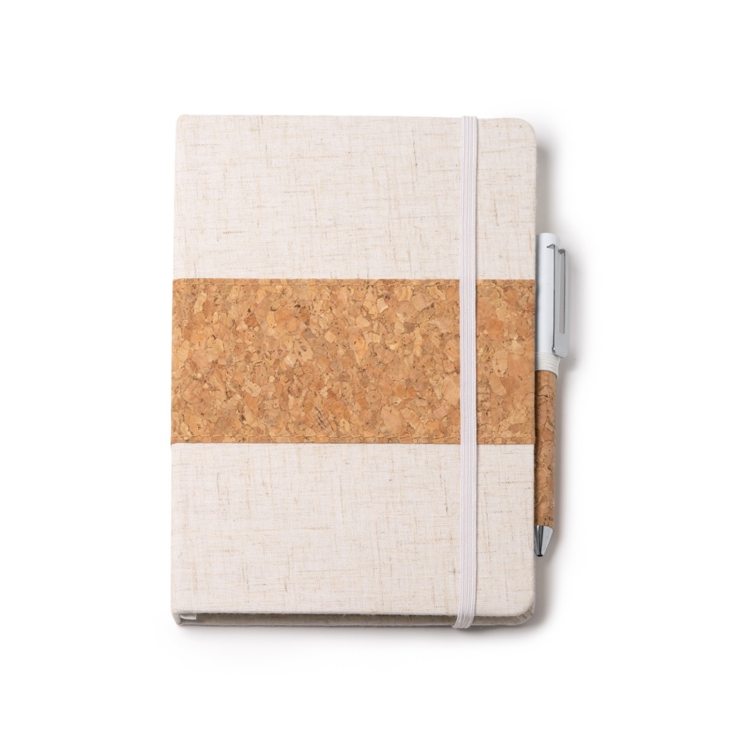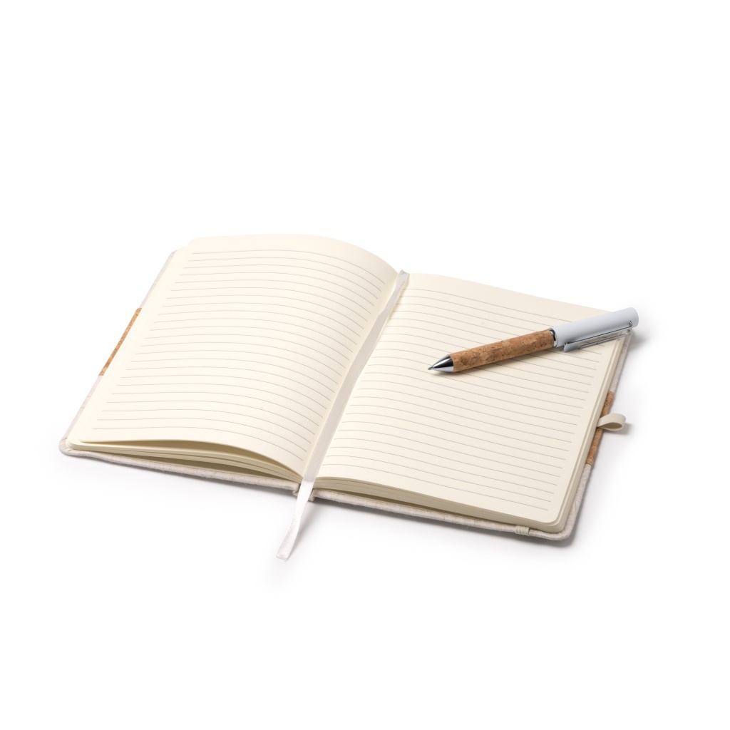 A set comprising an A5 notebook and a pen, presented in a kraft cardboard case. The notebook features a hard cover of cotton and cork and contains 80 line sheets. The pen is metal with a cork grip and uses blue ink.