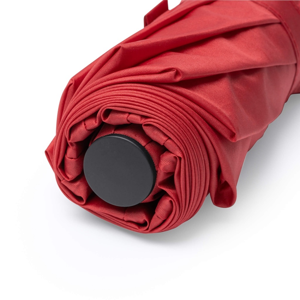 Automatic open folding umbrella crafted from 190T pongee, supplied with a matching pouch and designed to be windproof. Features a bamboo handle and a cotton strap. Packed in an environmentally conscious box.