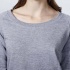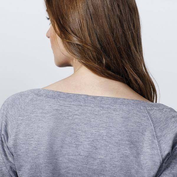 Bluza damska z raglanowymi długimi rękawami i zaokrąglonym dekoltem wykończonym lamówką 1x1. Ozdobne przeszycie pod szyją oraz szerokie mankiety i pas wykończone lamówką 1x1.