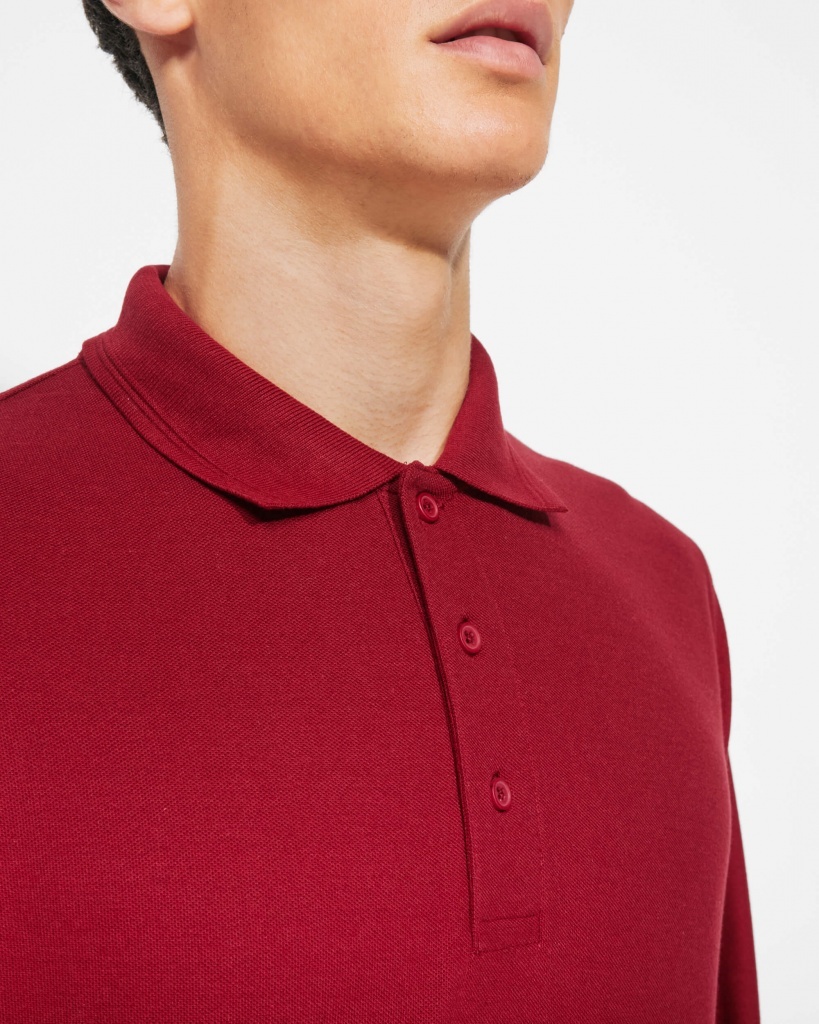 Koszulka polo z długim rękawem. Zapięcie na trzy guziki (dwa guziki w modelu dziecięcym). Prążkowany kołnierzyk i mankiety. Wzmocnione, kryte szwy przy kołnierzyku. Boczne rozcięcia. Elastyczne ściągacze przy mankietach.