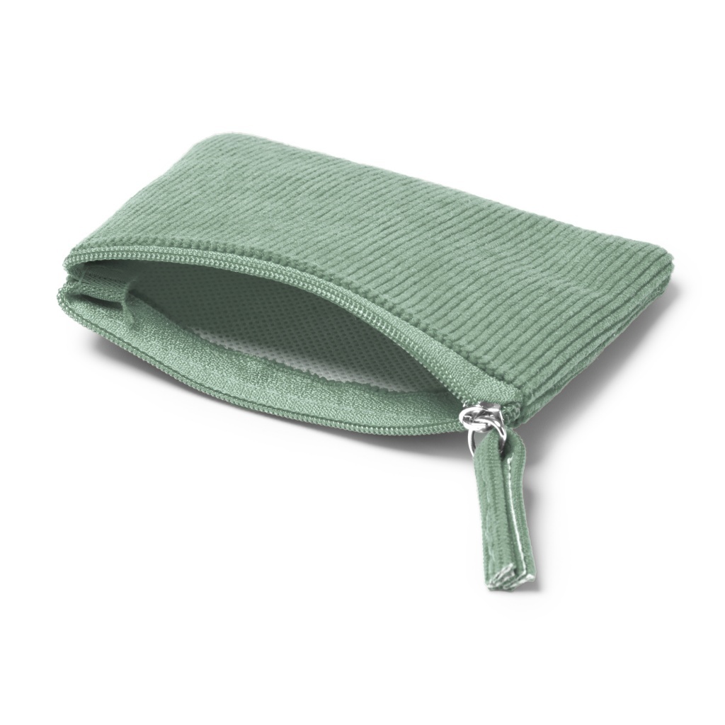Portmonetka wykonana z tkaniny sztruksowej, zamykana na zamek błyskawiczny.