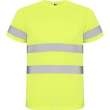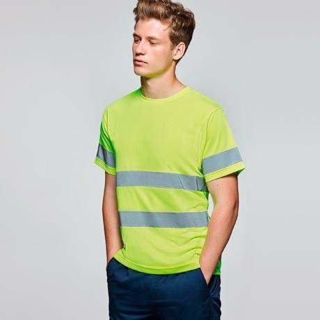 Techniczna koszulka z krótkim rękawem zapewniająca wysoką widoczność. Okrągły dekolt wykonany z tej samej tkaniny z wzmocnionymi szwami. Dwie poziome taśmy odblaskowe na środku oraz pojedyncze taśmy na rękawkach.