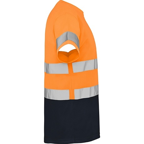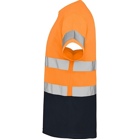 Techniczna koszulka z krótkim rękawem zapewniająca wysoką widoczność. Okrągły dekolt wykonany z tej samej tkaniny z wzmocnionymi szwami. Dwie poziome taśmy odblaskowe na środku oraz pojedyncze taśmy na rękawkach.