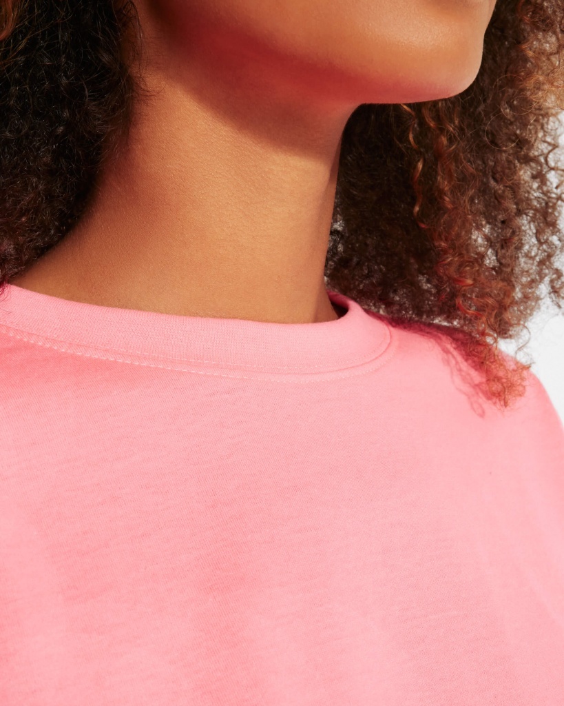 Koszulka z krótkim rękawem o luźnym kroju. Okrągły, prążkowany dekolt. Wzmocnione, kryte szwy w tym samym kolorze.