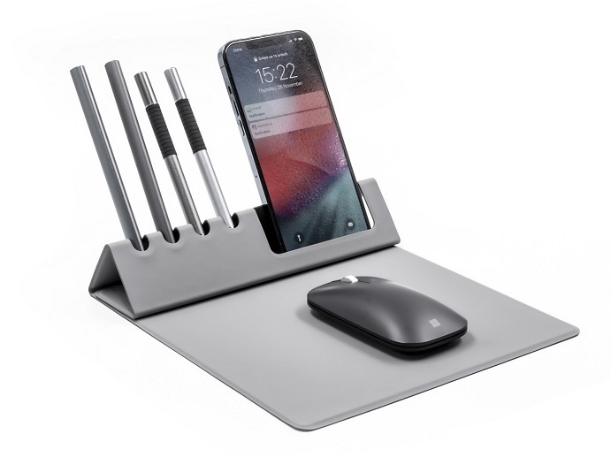 Odśwież swoje stanowisko z Evopad — uniwersalnym, przenośnym akcesorium biurkowym, które łączy podkładkę pod mysz, stojak na telefon oraz miejsce na długopisy.
