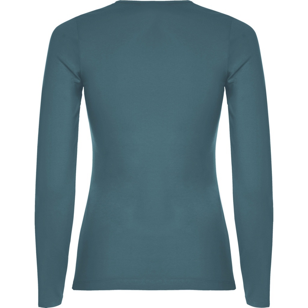 Damska koszulka z długim rękawem o dopasowanym kroju. Bez mankietów. Posiada szwy boczne.