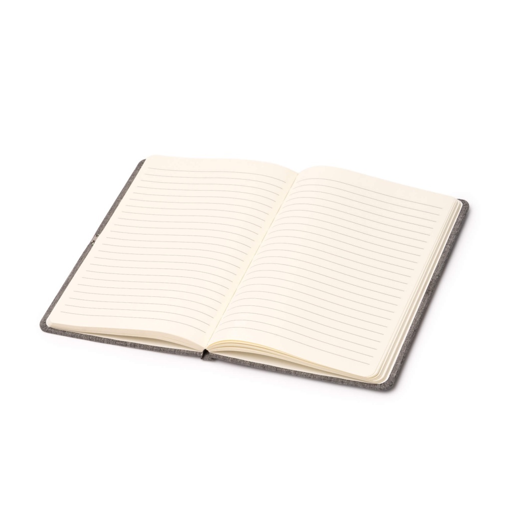 Notatnik w formacie A5 wykonany z tkaniny RPET, wyposażony w bezprzewodową ładowarkę o mocy 15 W. Posiada port USB typu C do zasilania oraz elastyczne zapięcie.