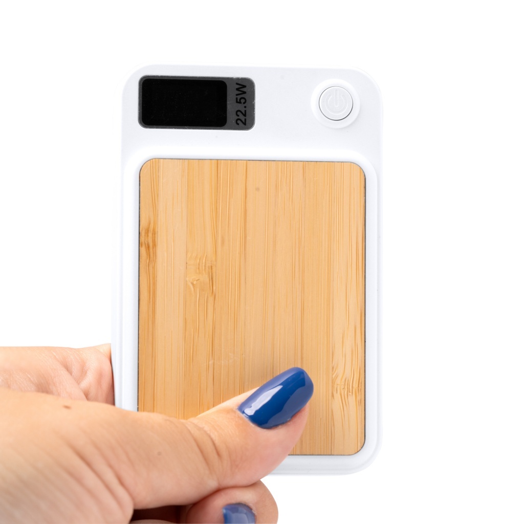 Powerbank z główną konstrukcją wykonaną z bambusa i tworzywa ABS pochodzącego z recyklingu. Pojemność: 5000 mAh. Funkcja magnetyczna: 15 W. Wyświetlacz LED ze wskaźnikiem naładowania baterii. Dodatkowy pierścień samoprzylepny w zestawie. Zapakowany w pudełku zaprojektowanym z myślą o środowisku