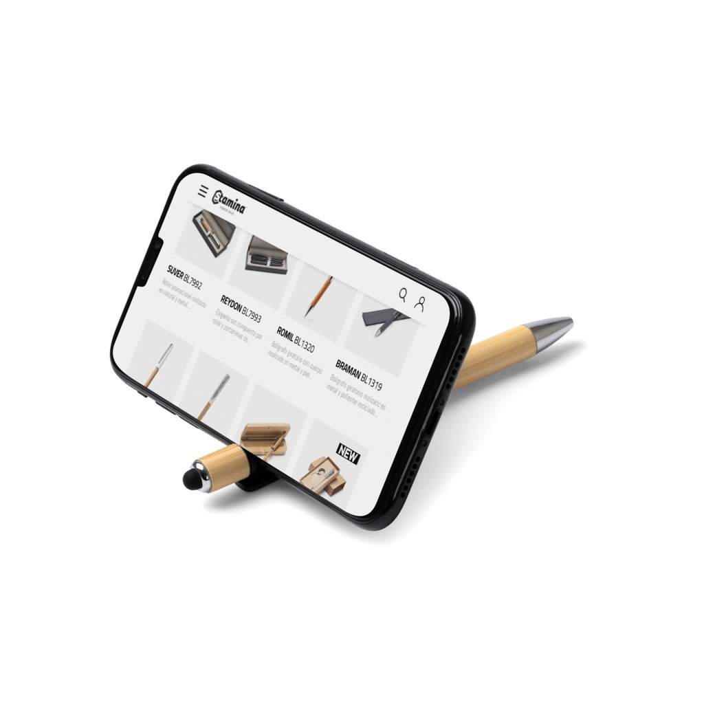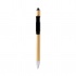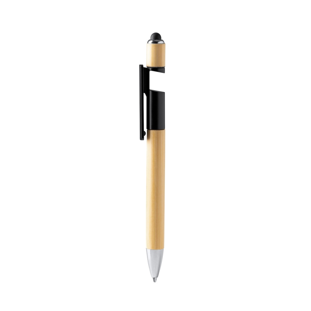 Długopis wyposażony w antystresowy spinner, bambusowy korpus z uchwytem na smartfon, z rysikiem i metalicznym wykończeniem. Niebieski tusz.