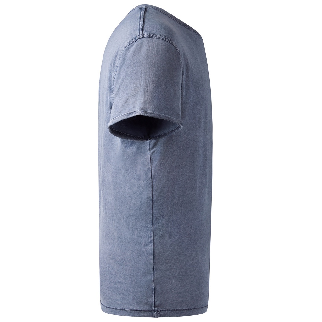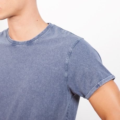 T-shirt z krótkim rękawem o dżinsowym wykończeniu. Okrągły, prążkowany dekolt, wzmocniony szew na ramieniu, podwójne szwy w pachach oraz wywijane mankiety.