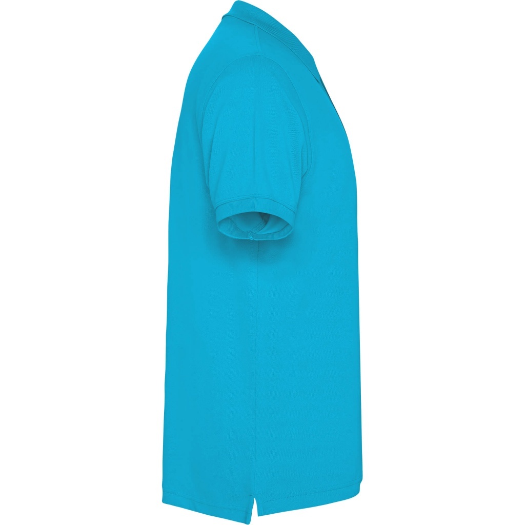Model z krótkim rękawem o wysokiej jakości wykonania. Kołnierz zapinany na trzy guziki w kolorze koszulki. Kołnierzyk i mankiety prążkowane 1x1. Wzmocnione, kryte szwy przy kołnierzu. Boczne rozcięcia z krytymi szwami. Dłuższy tył dla lepszego dopasowania. Podwójne przeszycia na ramionach, rękawach oraz u dołu koszulki.