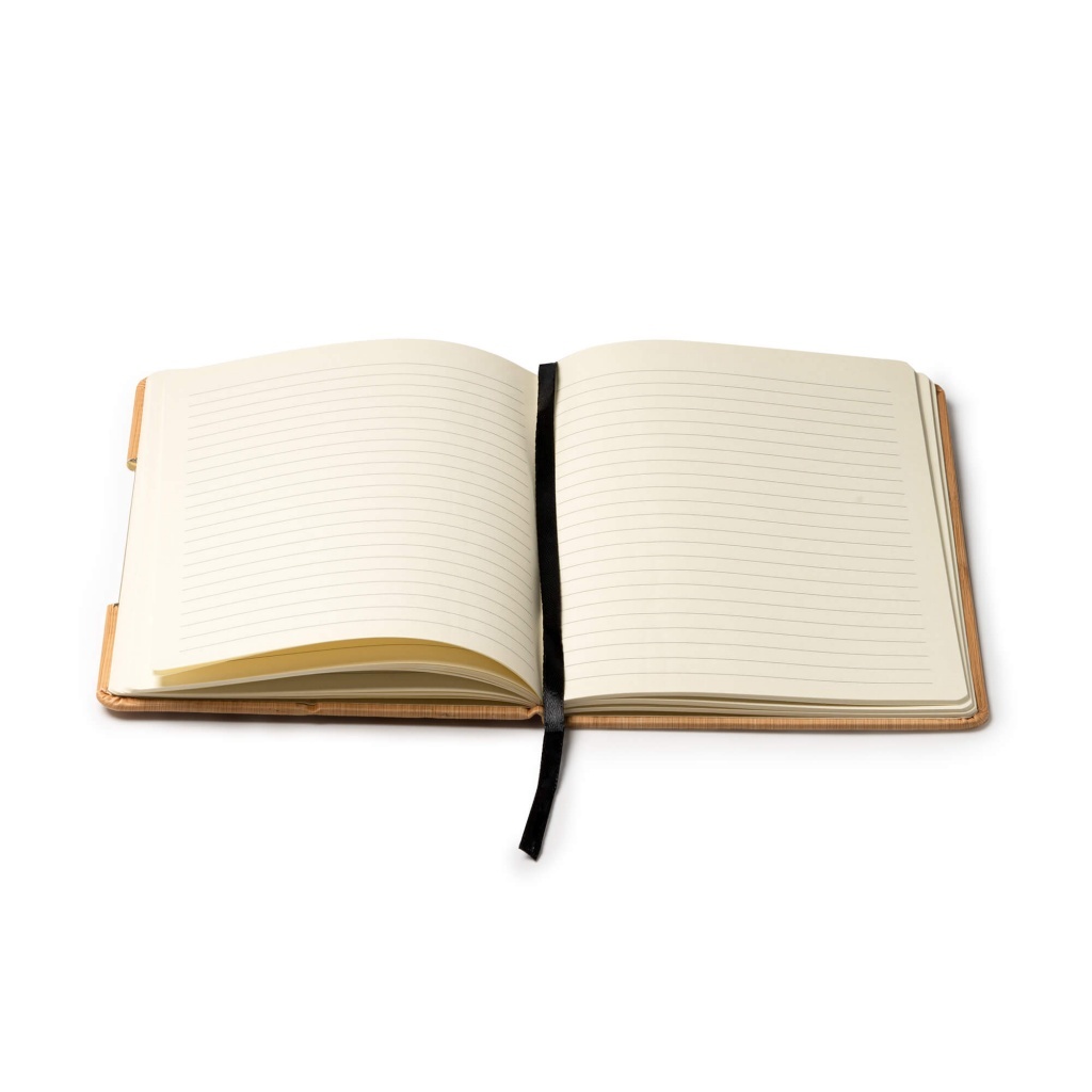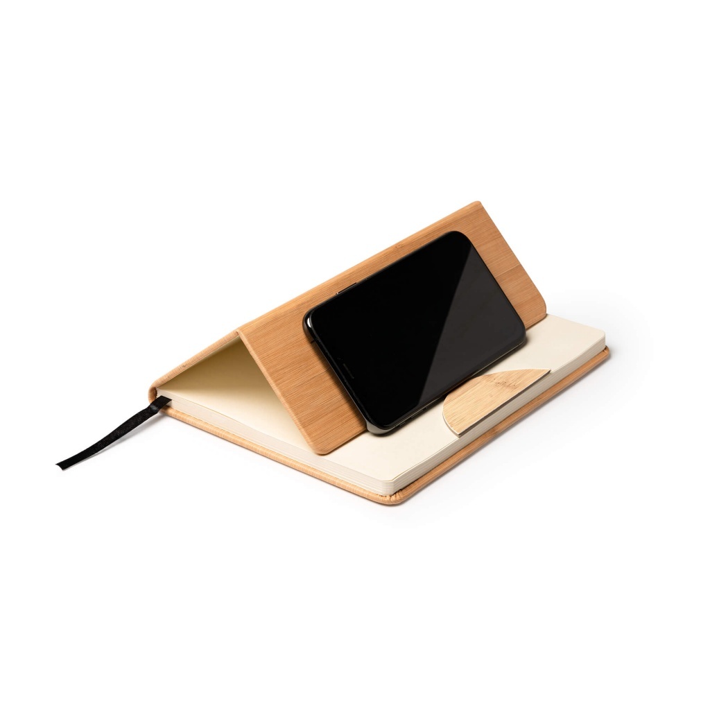 Zeszyt A5. Wyposażony w bambusowe, twarde okładki pełniące funkcję stojaka na telefon, wszytą zakładkę oraz 80 kartek w linie.