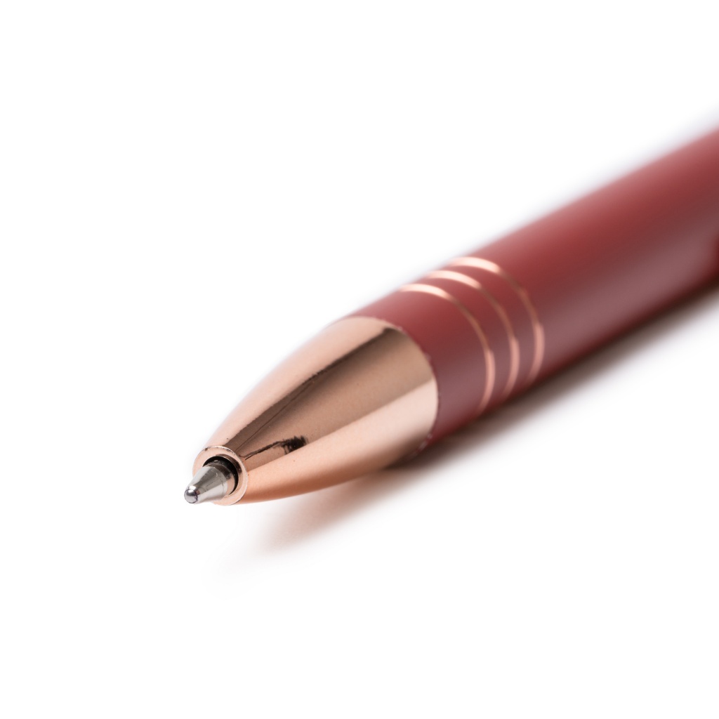 Długopis z mechanizmem wciskanym, metalowym, matowym korpusem oraz miedzianymi elementami. Na przycisku umieszczony wskaźnik dotykowy. Wkład atramentowy Jumbo w kolorze niebieskim.