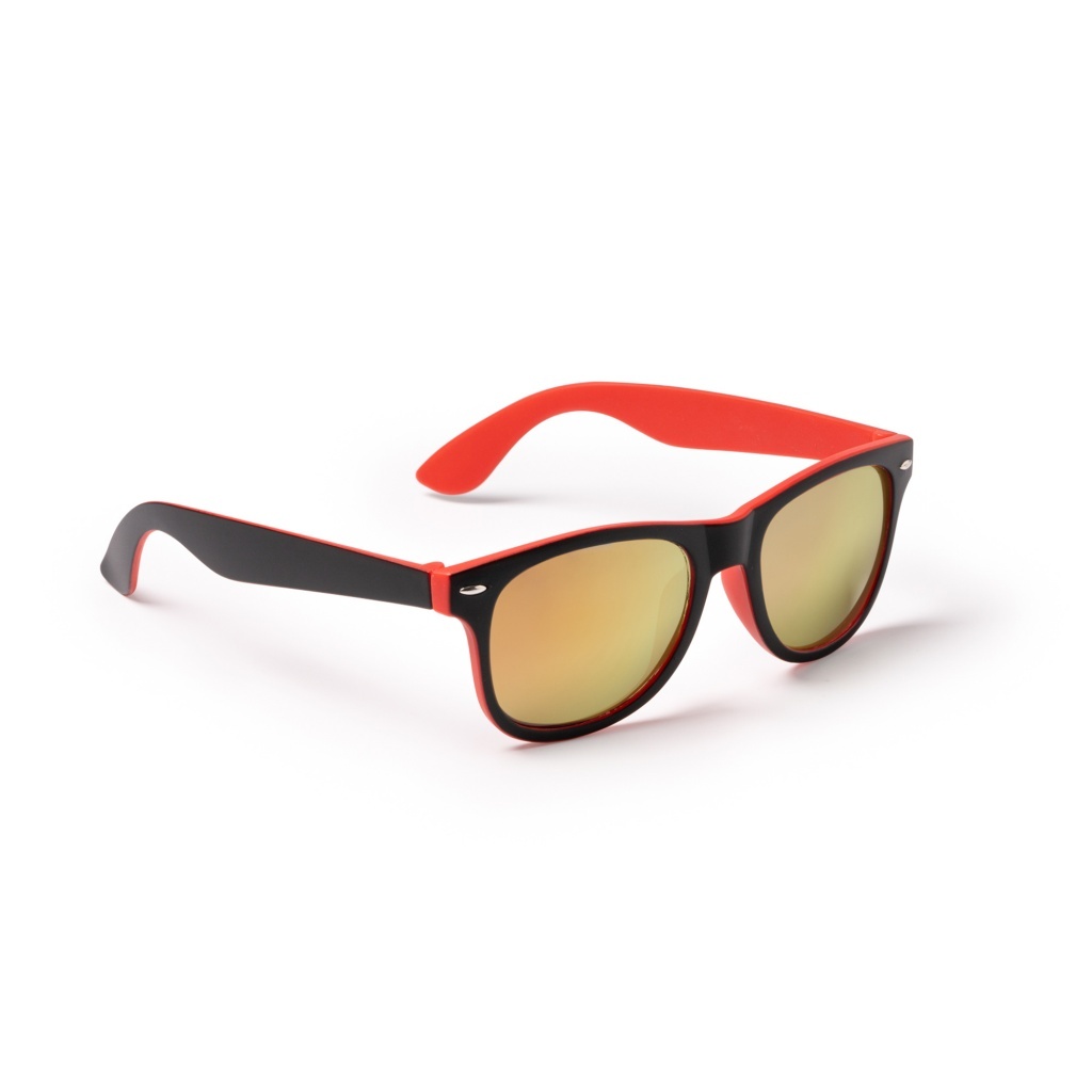 Klasyczne okulary przeciwsłoneczne z dwukolorową oprawką. Soczewki lustrzane; filtr ochronny UV400.