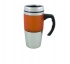 Stalowy kubek termiczny z podwójną ścianką, wyposażony w wygodną rączkę, idealny do zachowania temperatury napoju.