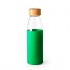 Elegancki szklany bidon wyposażony w bambusową nakrętkę oraz kolorową silikonową osłonę.
