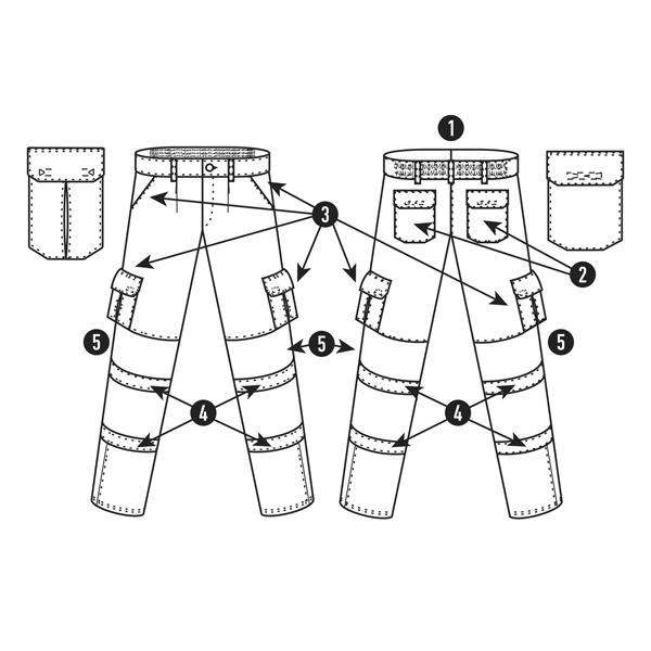 3. Dwie kieszenie z przodu i dwie kieszenie boczne z klapą i z zapięciem na rzep.