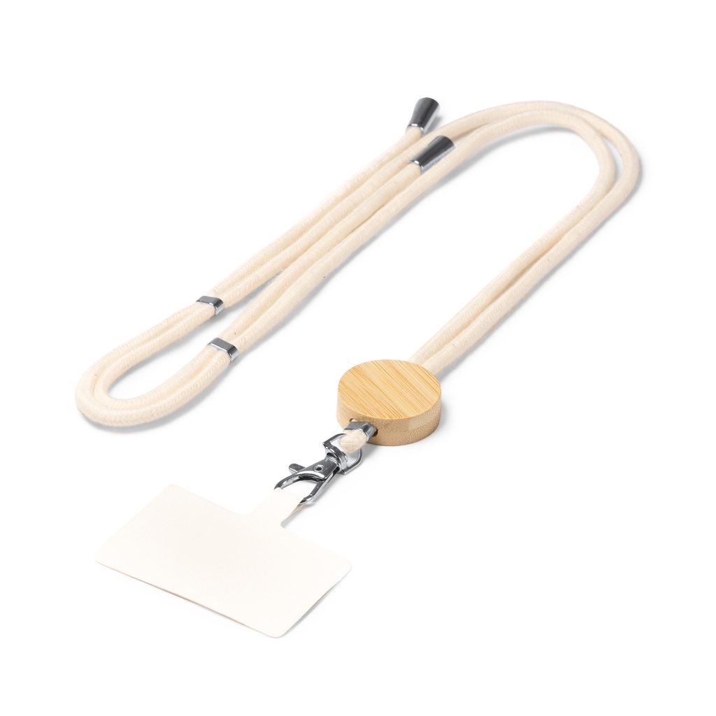 Smycz bawełniana z uchwytem na telefon, z bambusowymi elementami i systemem regulacji.