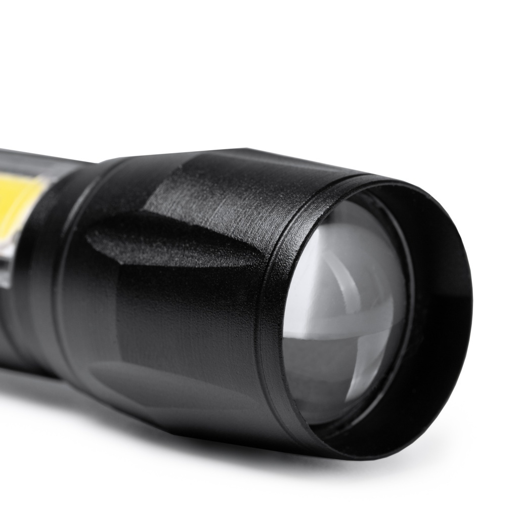Latarka LED wykonana z aluminium, wyposażona w 8 diod o łącznej mocy 250 lumenów. Posiada 3 tryby pracy: światło stałe, tryb awaryjny oraz boczne światło o mocy 100 lumenów. Zasilana akumulatorem o pojemności 400 mAh.