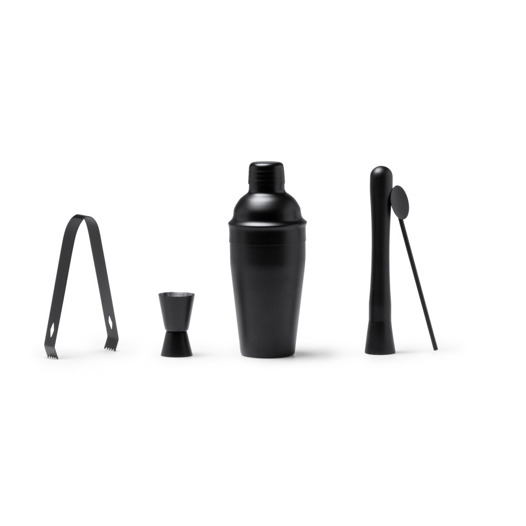 Kompletny zestaw barmański ze stali nierdzewnej 304: miarka, shaker 550 ml, szczypce, łyżka i rozdrabniacz. Produkt zapakowany w eleganckie pudełko.