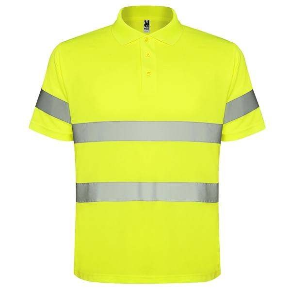 Techniczna, dobrze widoczna koszulka polo z krótkimi rękawami, zaprojektowana z kołnierzem prążkowanym 1x1, zapięciem na 3 guziki oraz dwoma poziomymi paskami o wysokiej widoczności na piersi i rękawach. Materiał odporny na zaciągnięcia zapewnia trwałość podczas intensywnego użytkowania.