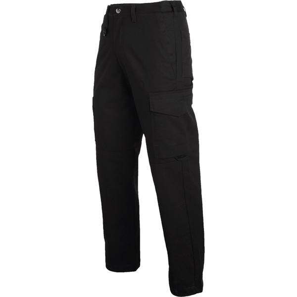Prosty fason bez zaszewek. Dwie kieszenie tylne oraz dwie boczne (prawa zapinana na suwak). Dodatkowo dwie kieszenie na nogawkach: lewa z klapą i małą kieszonką na telefon komórkowy, prawa z kilkoma przegródkami. W talii wieszak na klucze. Podwójna warstwa tkaniny na kolanach dla zwiększonej ochrony. Szlufki na tylnej i bocznych kieszeniach.
